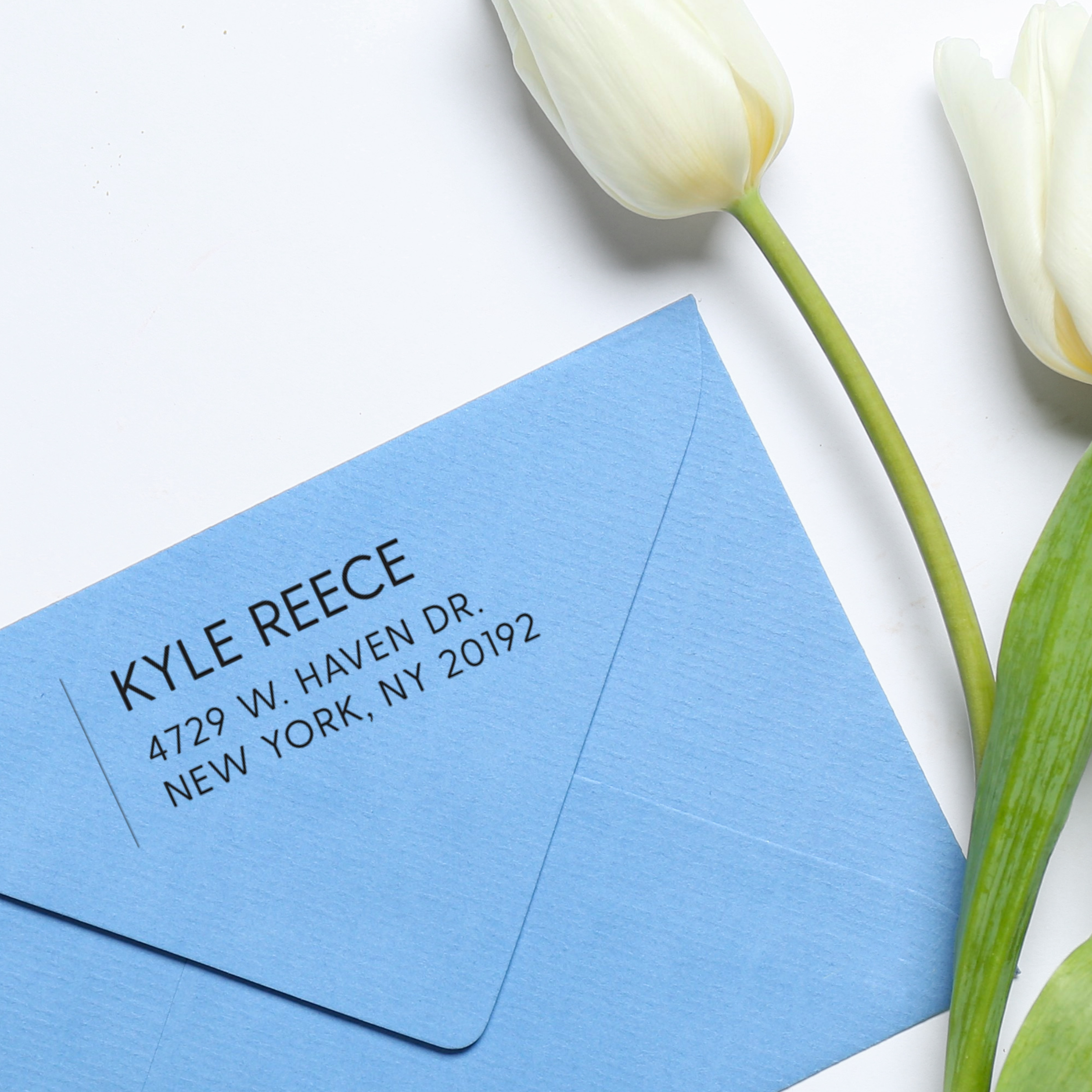 This minimalistic, left-aligned address stamp is great for stamping on envelopes, packages and more! Start with our template and add your stamp text to fit your needs. Our stamps are laser engraved for a crisp stamp impression and long lasting performance. Send your mail with style when you order this simple return address stamp online!