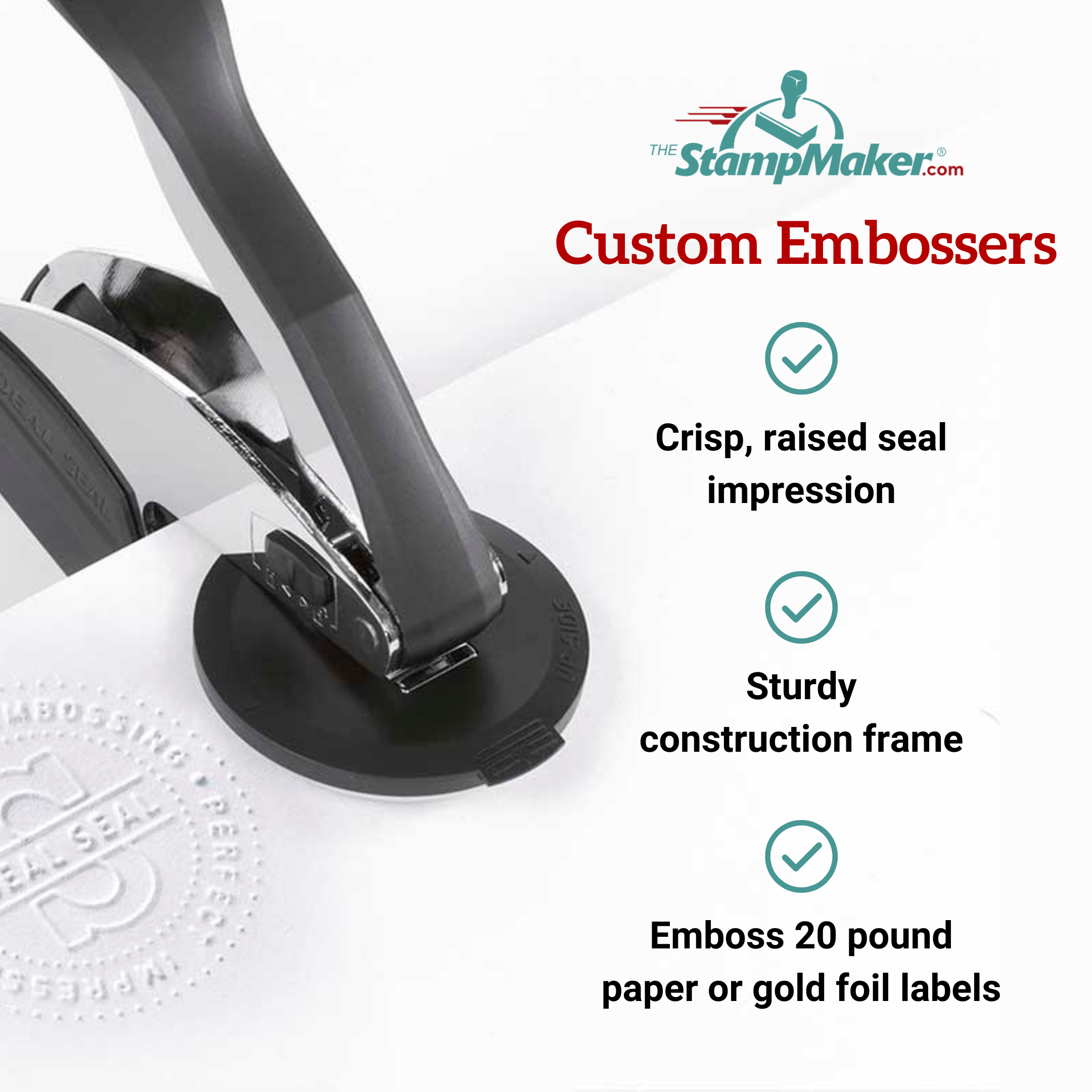 • Custom embosser is laser engraved for a premium quality rubber stamp impression.