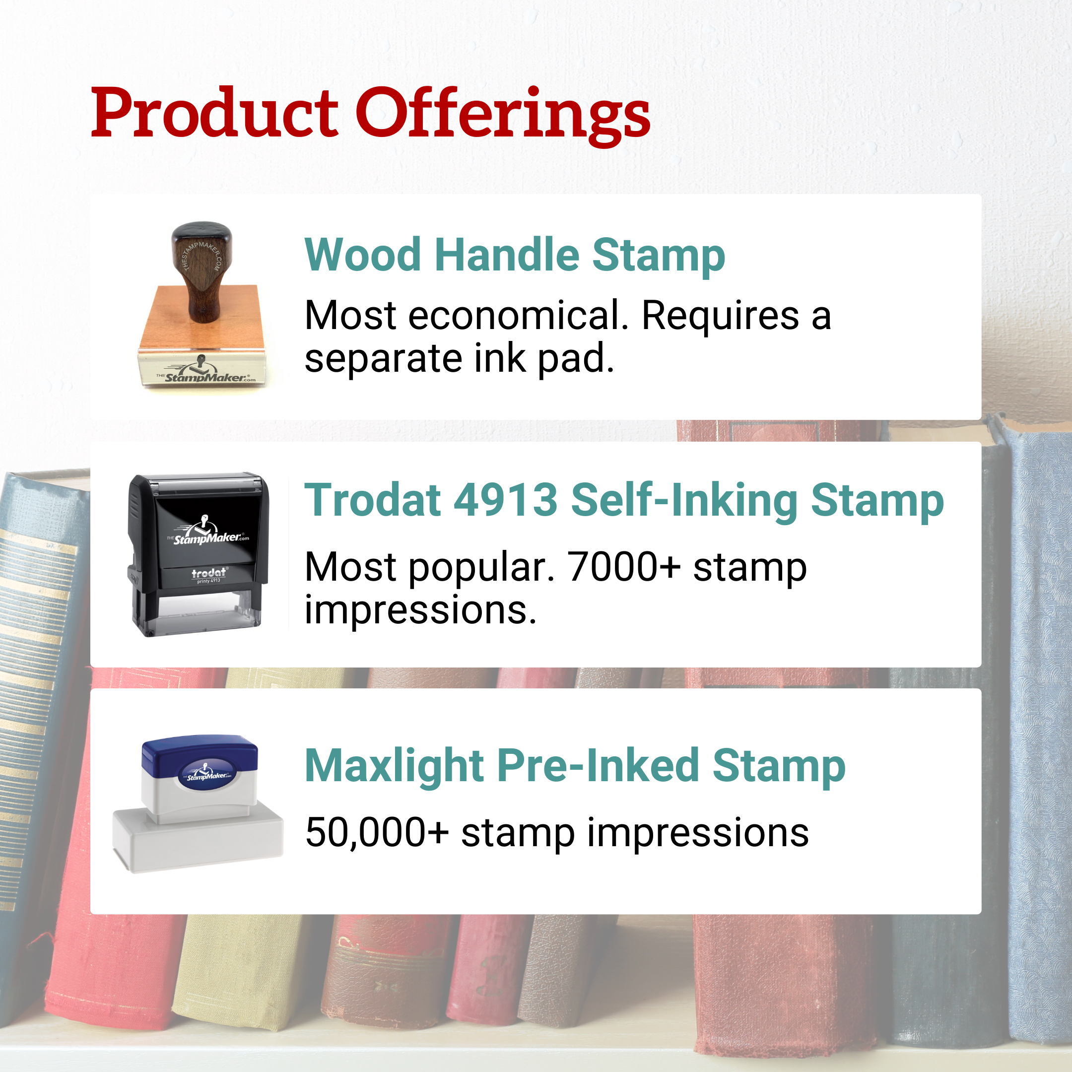 • Available as a wood handle stamp, self-inking stamp, pre-inked stamp.