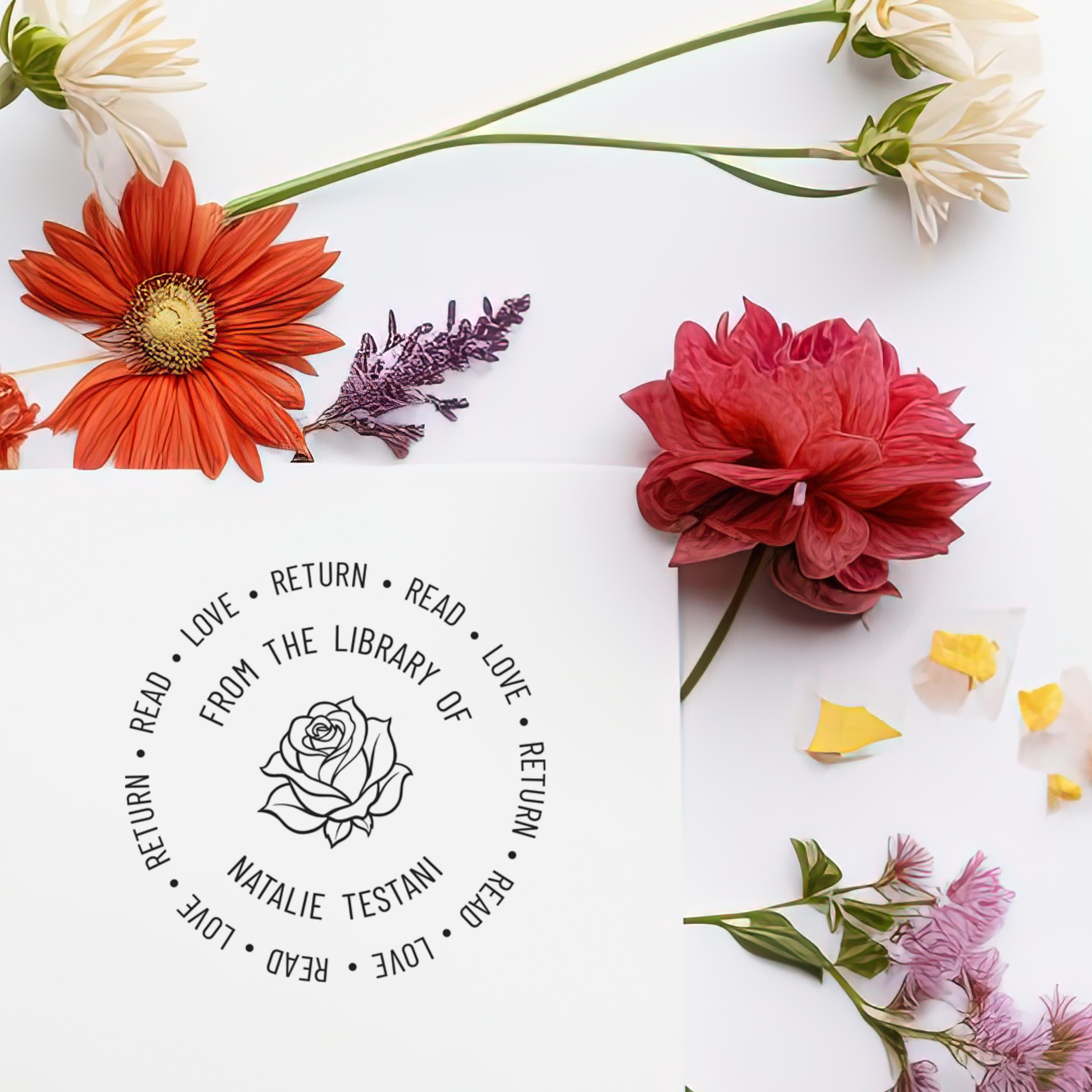 This circular rose stamp will look beautiful stamped on the inside cover of your books! Start with our template and add your stamp text to customize your library stamp. Our stamps are laser engraved and assembled by our experienced team. Whether you are lending a book to a friend or looking for a unique gift, this cute stamp will add a special touch to your books!