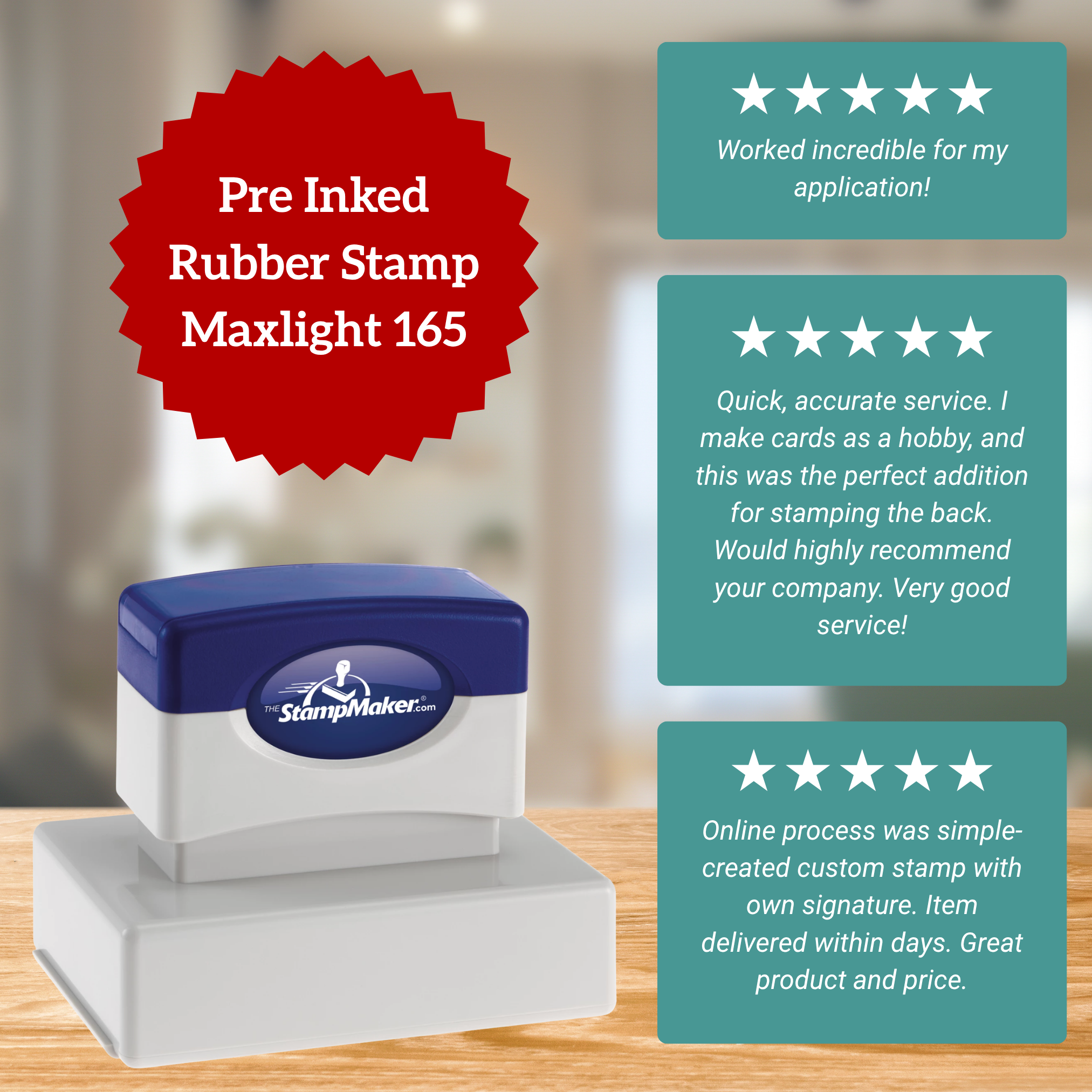 This is my third Maxlight XL pre-inked stamp. It's fantastic. Being able to design my own stamp and control the font, size, and image placement is great. Easy to use and refill, it produces a crisp, sharp stamped image each time. The ink is high quality and dries fast. This is definitely my go-to stamp for my small business. Five stars!