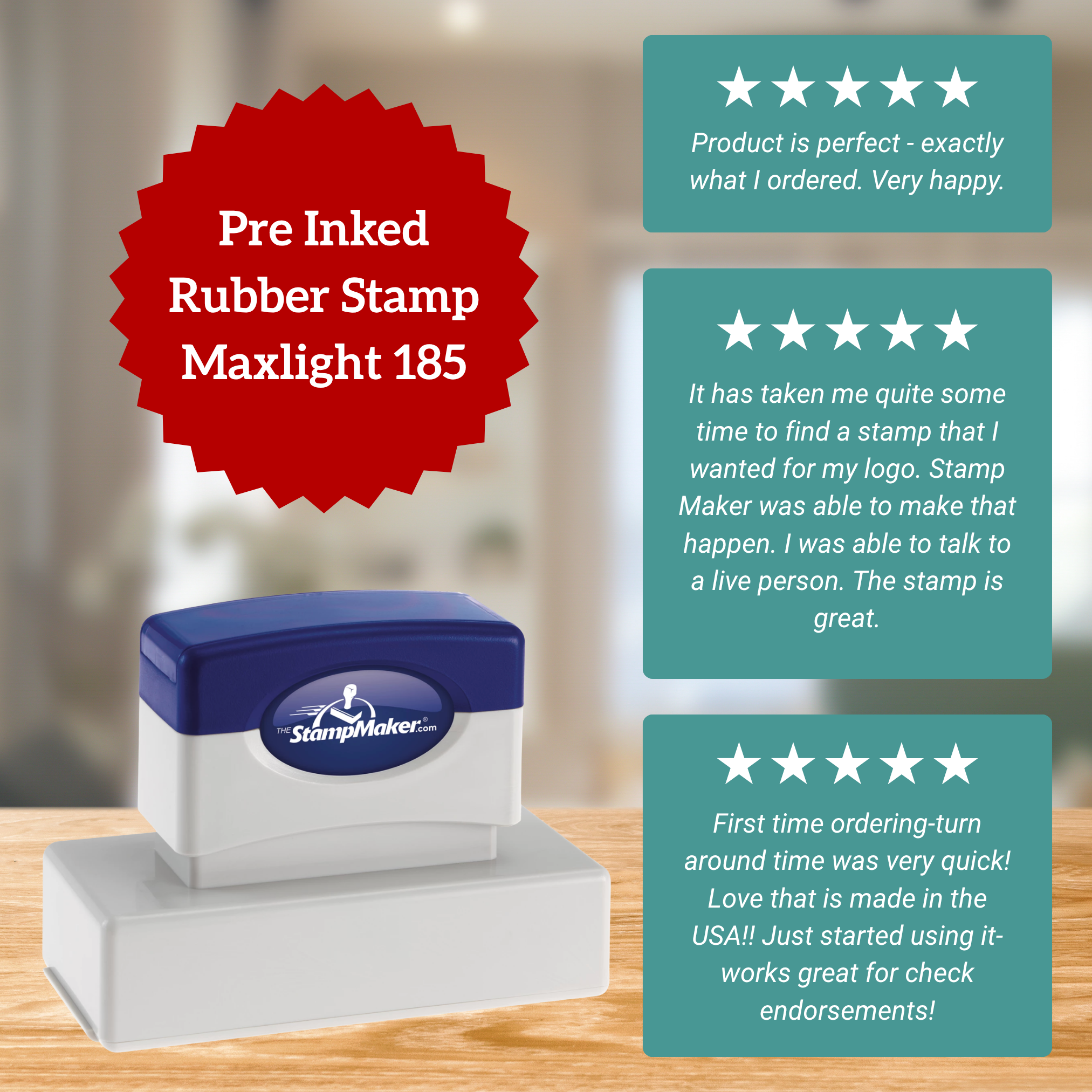 First time ordering-turn around time was very quick! Love that is made in the USA!! Just started using it-works great for check endorsements!