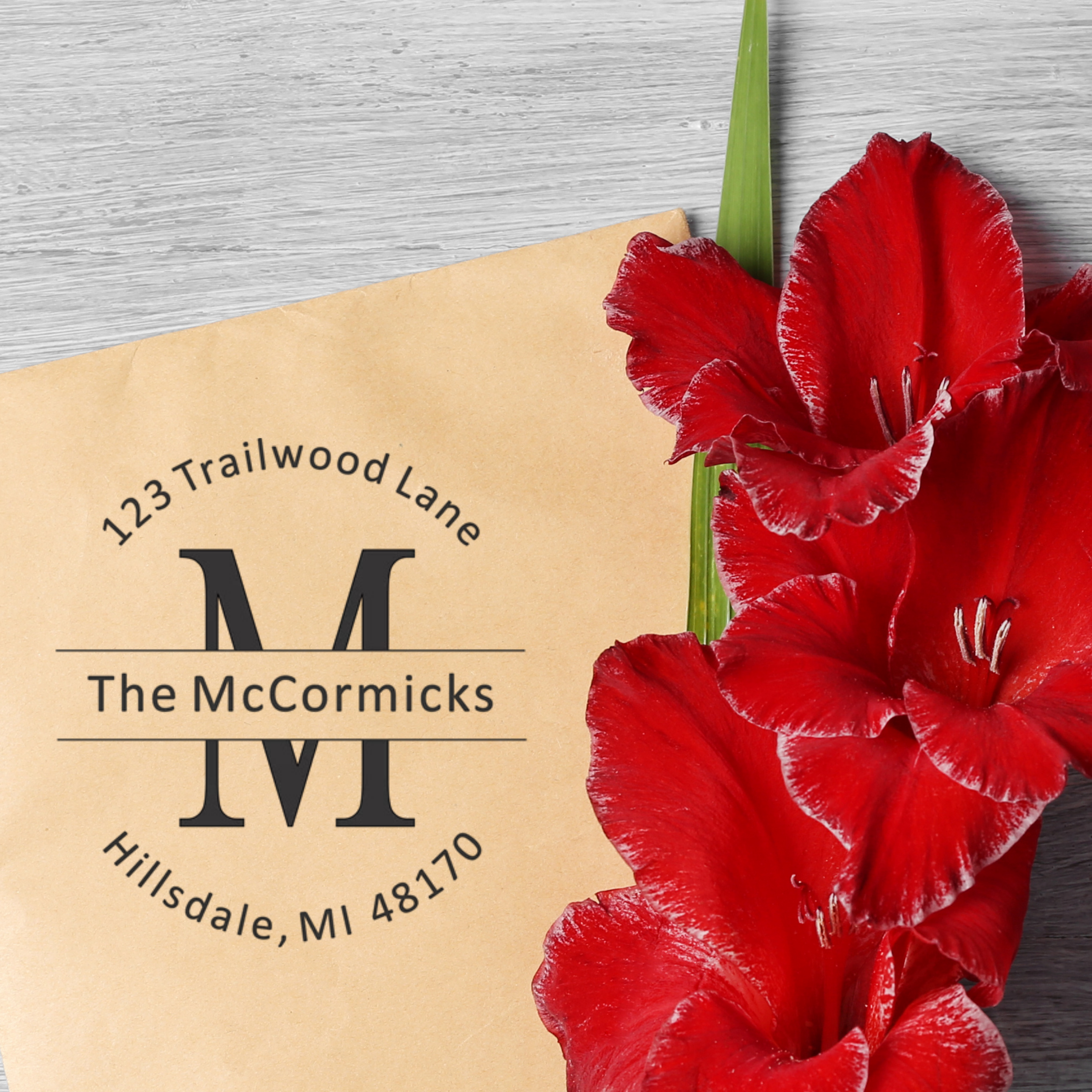This monogram return address stamp is our most popular design! Start with our template and add your stamp text to fit your needs. Our stamps are laser engraved and assembled in house by our experienced team. Whether you are gifting it or using it personally, this custom address stamp will add a special touch to envelopes, packages and more!