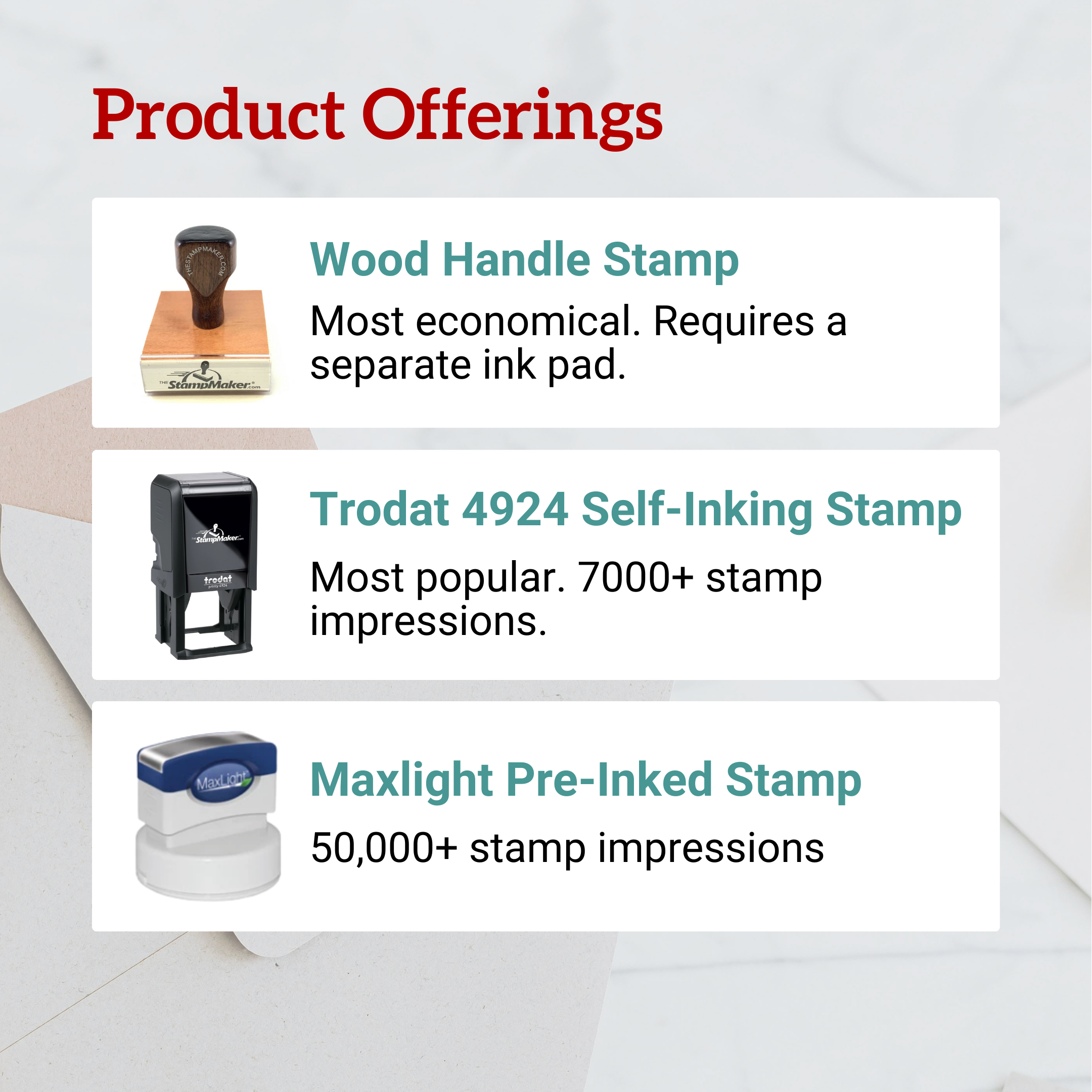• Available as a wood handle stamp, self-inking stamp, pre-inked stamp.