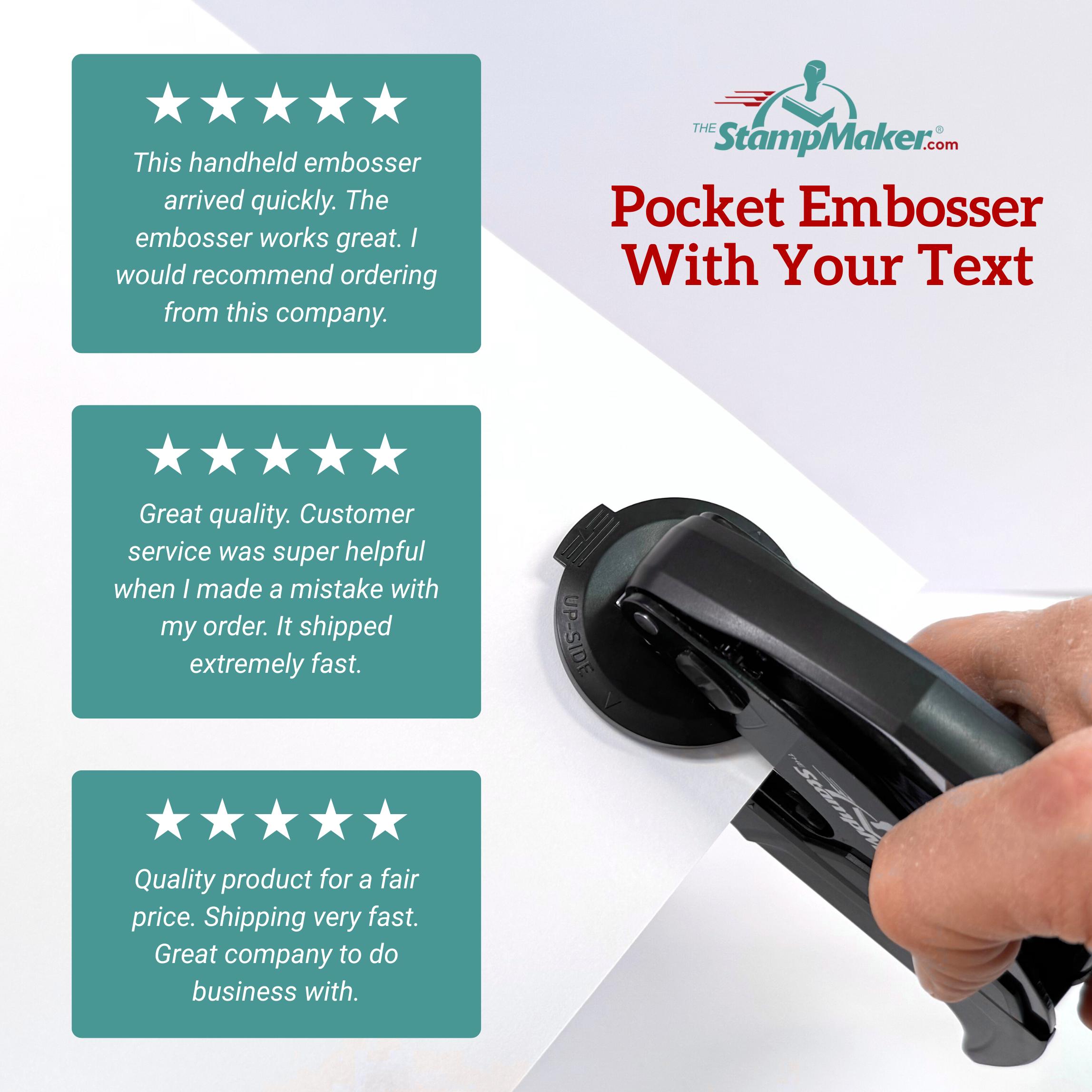 This handheld embosser arrived quickly. The embosser works great. I would recommend ordering from this company.