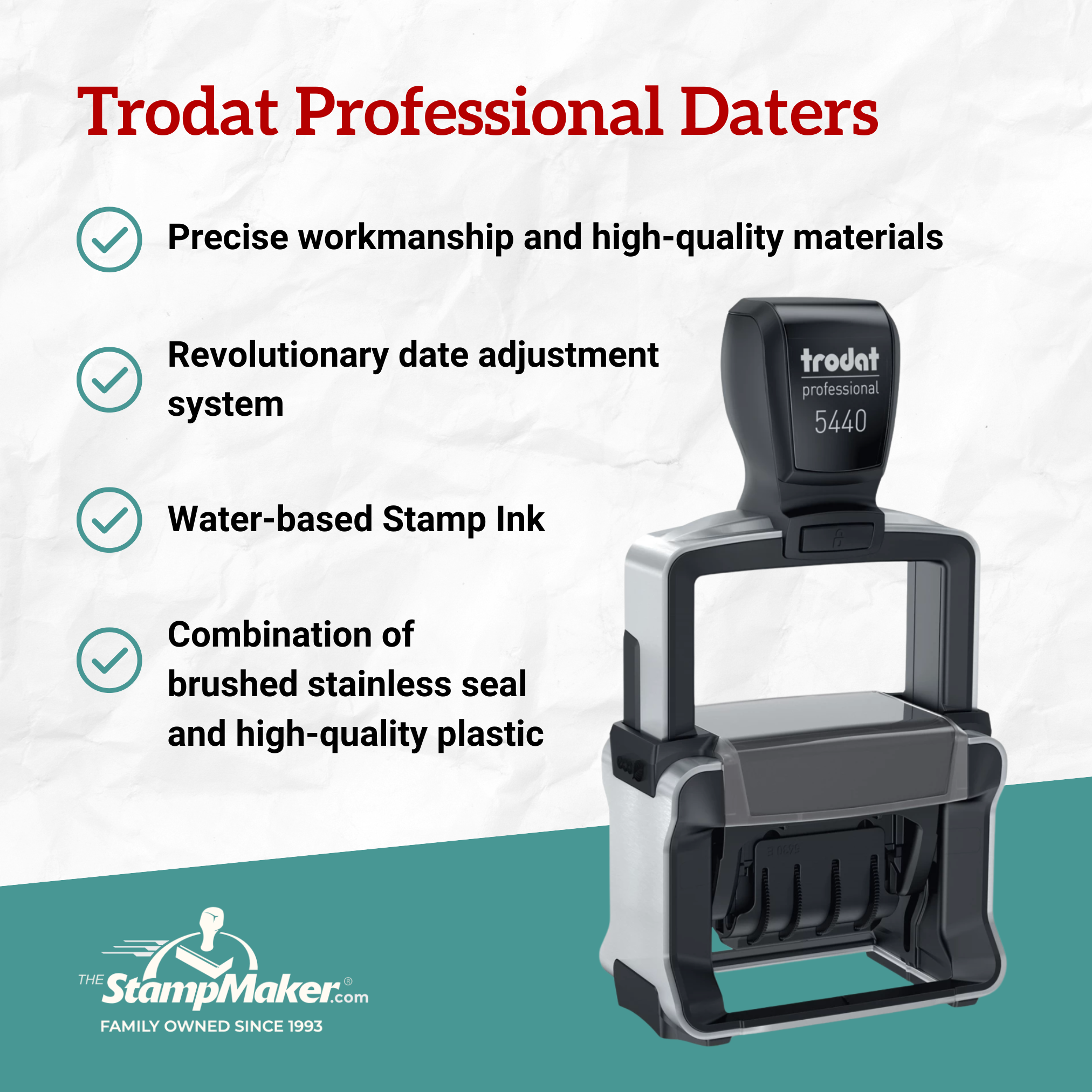 In stock dater stamp with 5/32" characters and phrases. Trodat date stamps have a smooth action movement for easy stamping and consistent stamp impressions. Streamline business processes and experience increased efficiency when ordering this date stamp online!