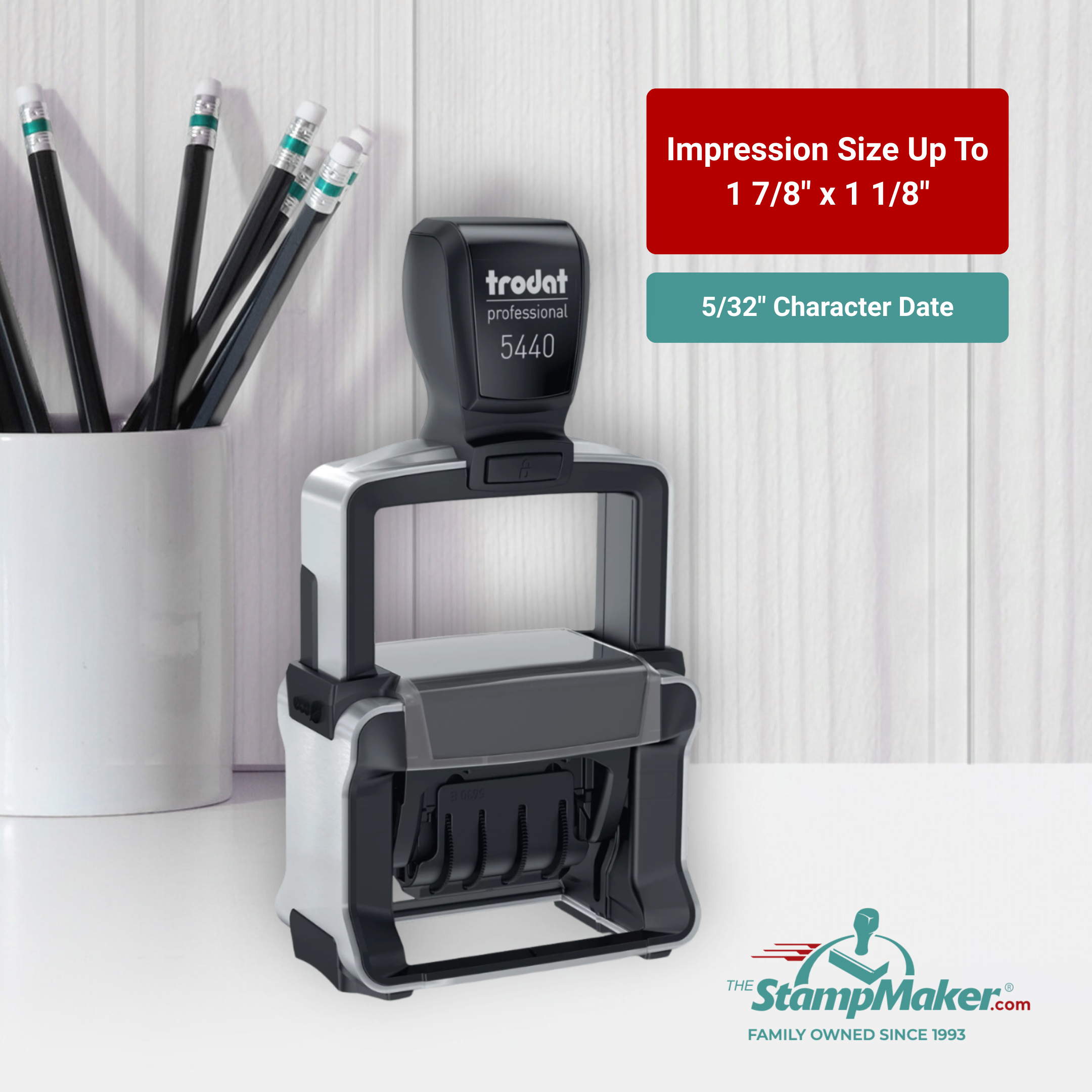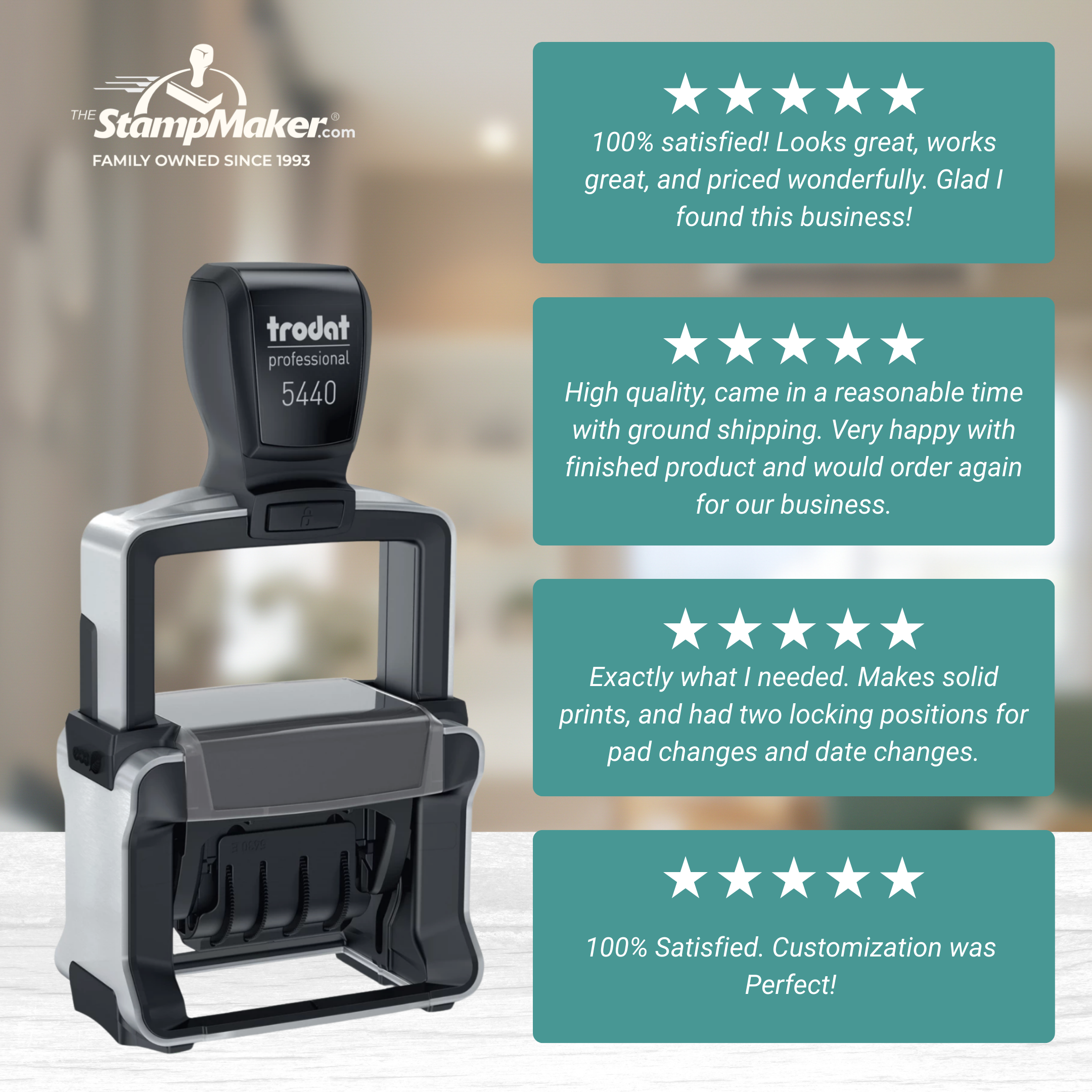 Easily design and order your dater stamp with your custom text. Trodat date stamps have a smooth action movement for easy stamping and consistent stamp impressions. Experience increased efficiency and endless possibilities when ordering your self inking stamp online!