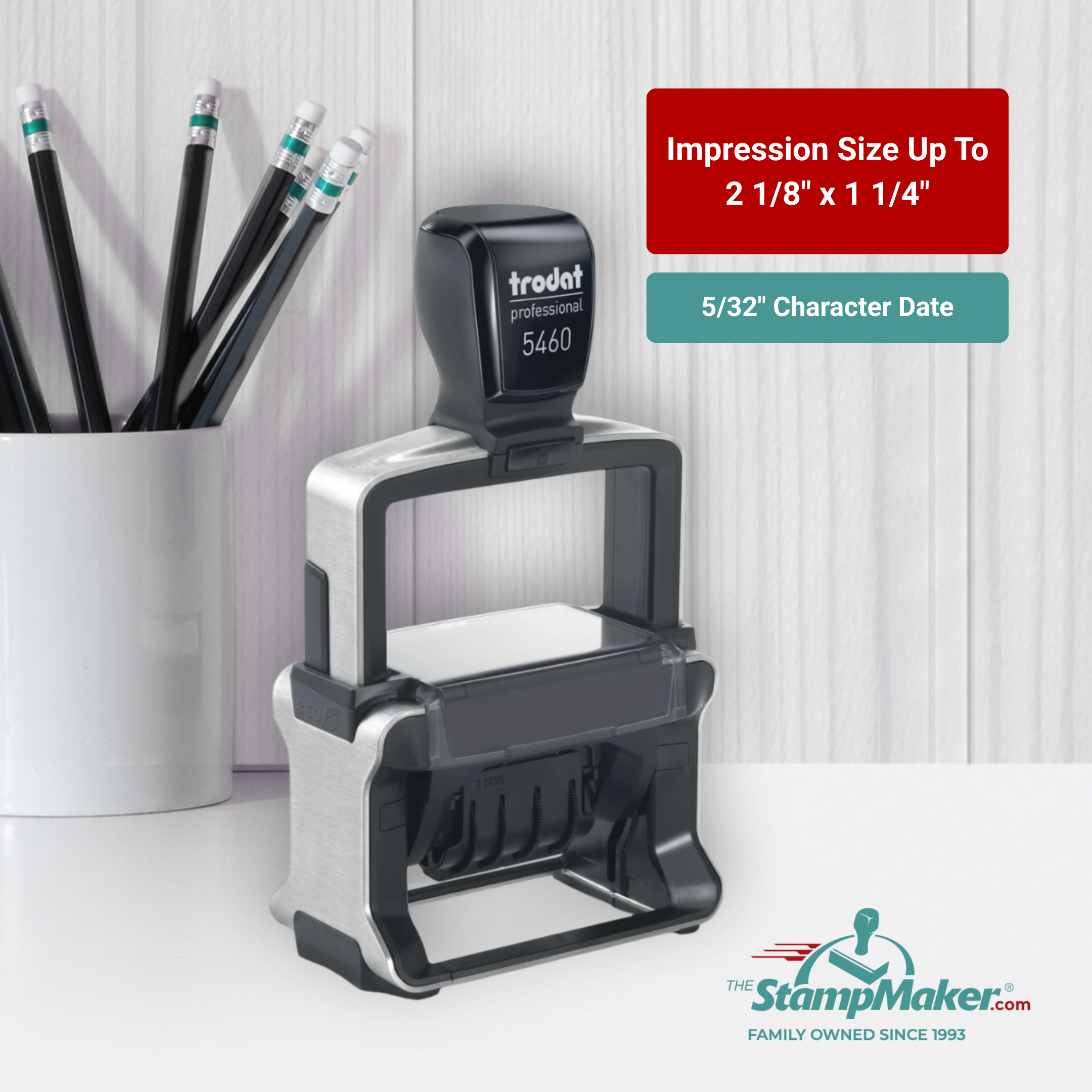 • Stamp Area: 2 1/8" x 1 1/4", with 5/32" character date, plus your text.