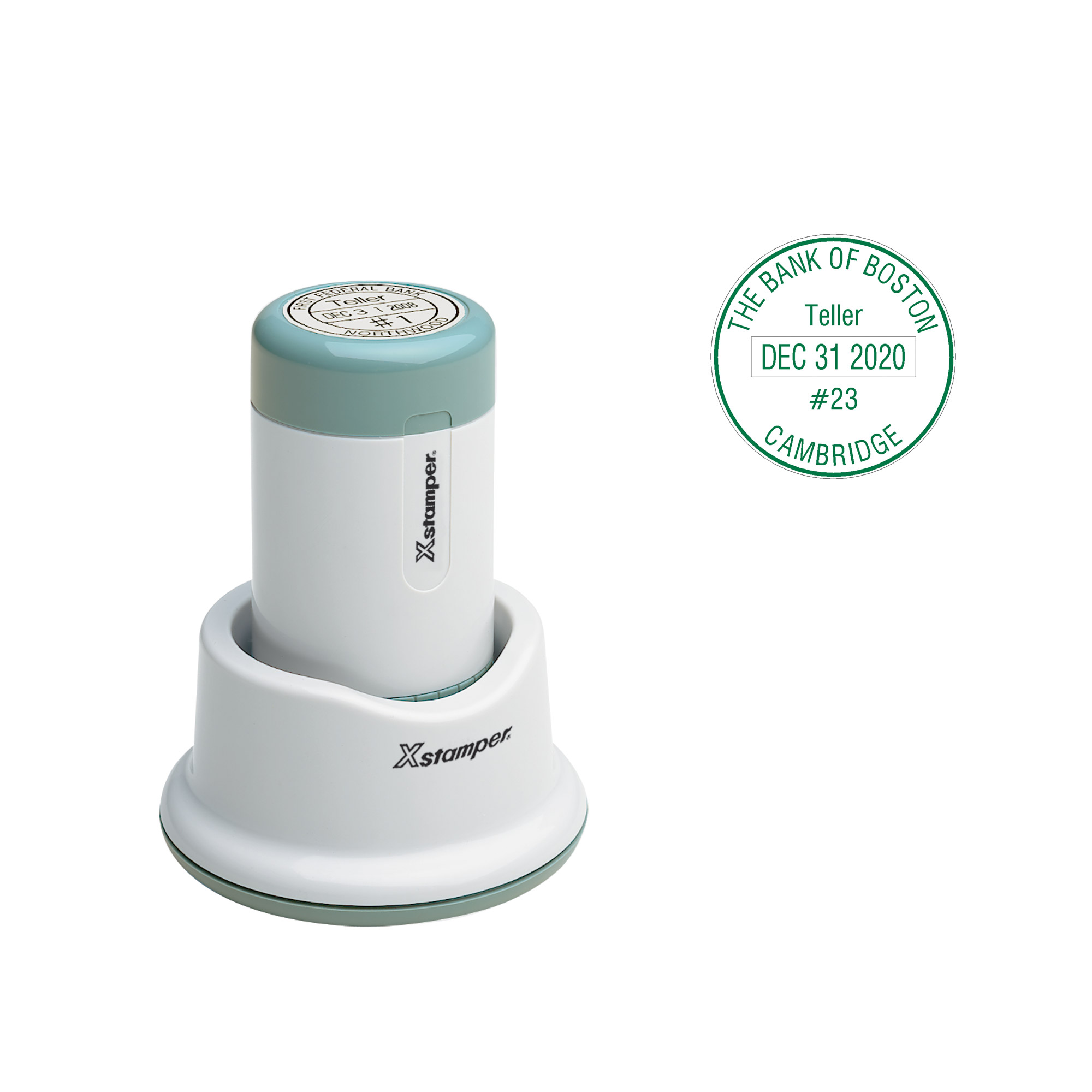 • Custom stamp allows for 2 lines of custom text above the date and up to 2 lines of custom text below the date.