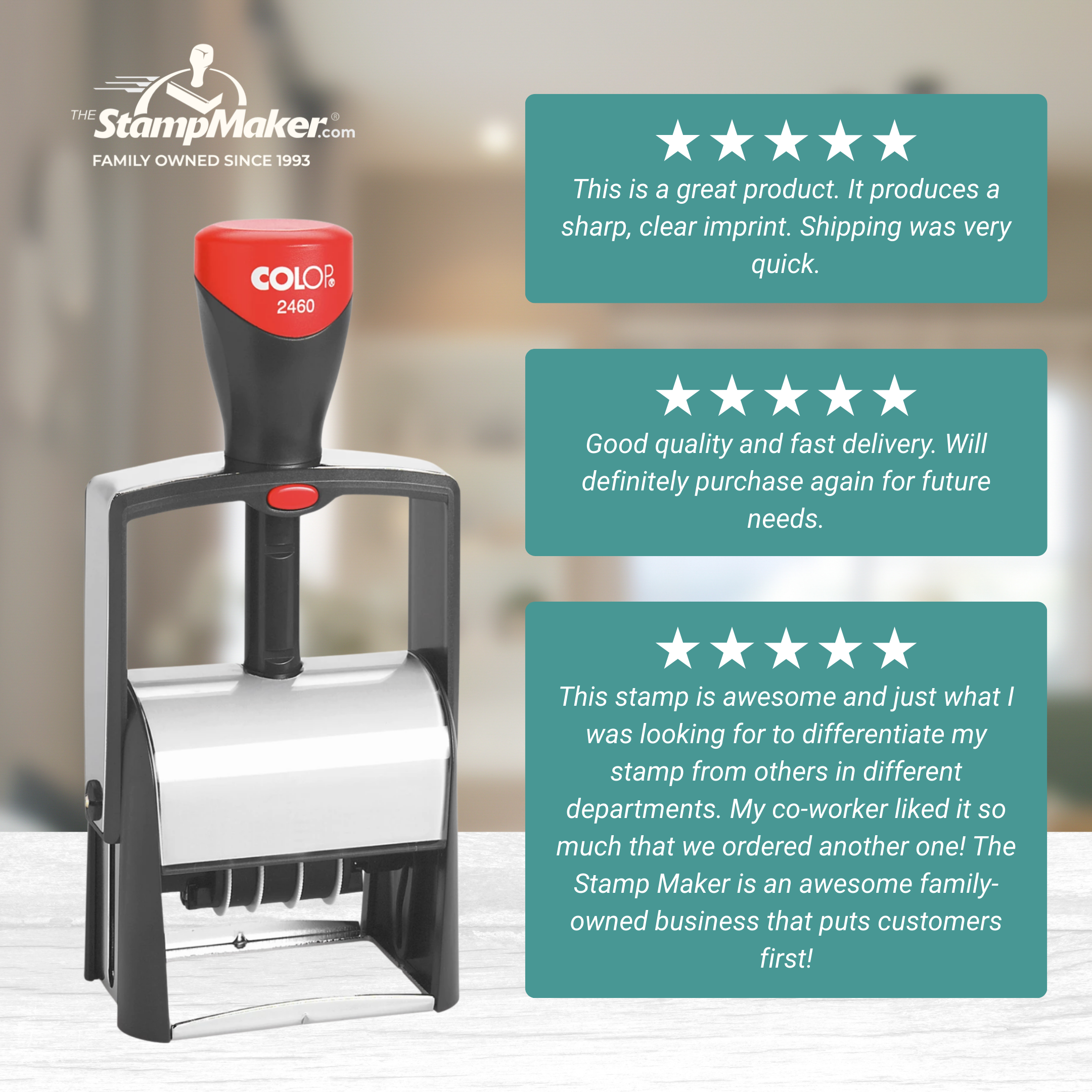 Easily design and order your dater stamp with your custom text. Colop date stamps have a smooth action movement for easy stamping and consistent stamp impressions. Streamline business processes and experience increased efficiency when ordering this date stamp online!